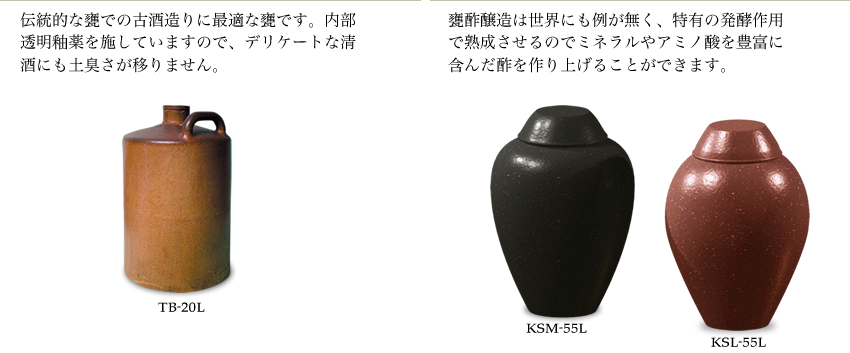 焼酎・清酒・酢・醤油・味醂などあらゆる醸造品の貯蔵に適した黄河の大甕。丸形(K)、タンク型(T)の2タイプの形状と、豊富な容量により、醸造元の貯蔵場所や目的に合わせた選択が可能。深みある濃厚な甕熟成の手応えをお確かめください。
