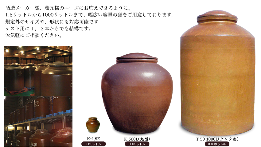 酒造メーカー様、蔵元様のニーズにお応えできるように、 1.8リットルから1000リットルまで、幅広い容量の甕をご用意しております。 規定外のサイズや、形状にも対応可能です。 テスト用に1,2本からでも結構です。 お気軽にご相談ください。
