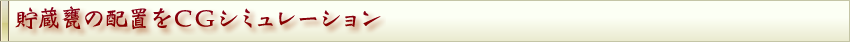 甕の配置に悩んでいませんか? 一度配置すると簡単に配置換えできない貯蔵甕。当社ではオリジナルのCGデータを用いて、事前に配置シミュレーションを行い具体的な配置プランを作成することができます。 限られたスペースを有効活用するお手伝いをいたします。