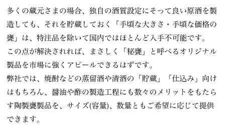 ※陶器の特質上、「寸法」および「色合い」が実際の製品と異なる場合がありますのでご了承願います。 ※本製品は酒造に用いる「容器」です。工芸品ではありませんので、若干の斑(むら)はご了承願います。